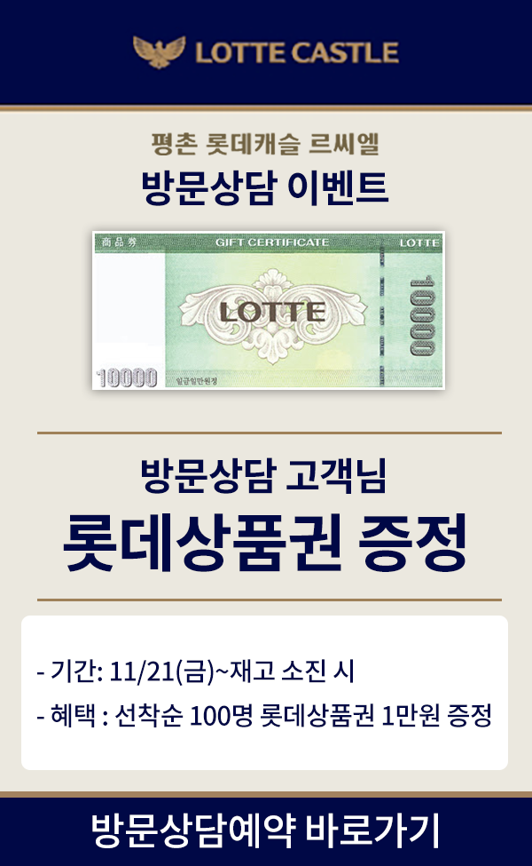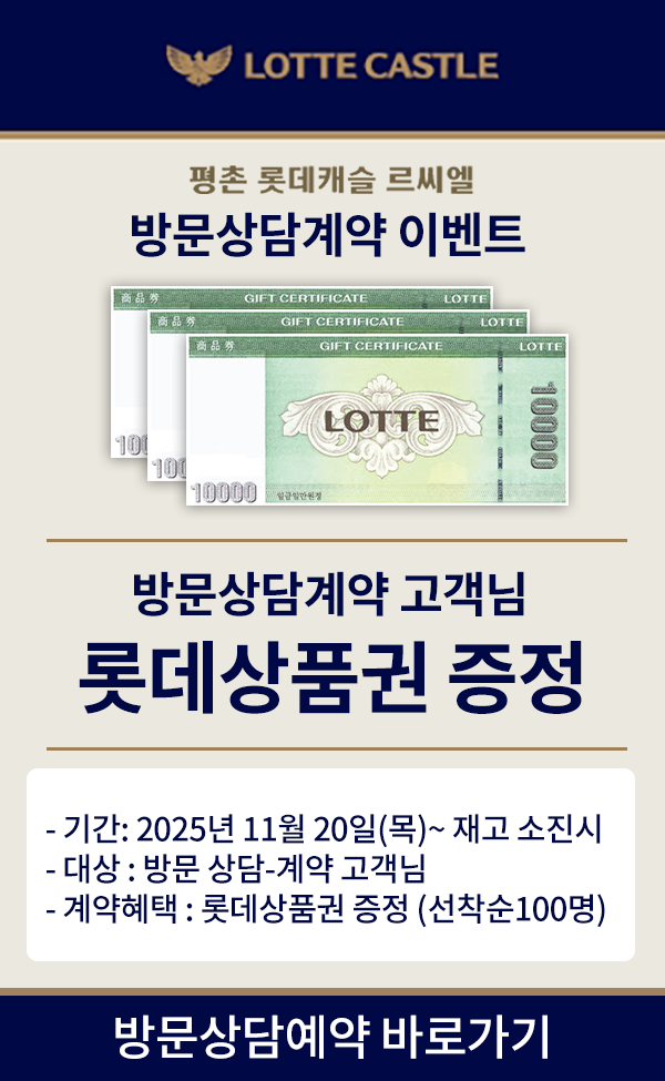 평촌 롯데캐슬 르씨엘 방문예약 고객의 개인정보를 수집합니다. 수집한 개인정보는 방문예약 이외의 목적으로는 사용하지 않으며, 모집 기간 완료 후 즉시 파기합니다. 개인정보의 수집 및 이용에 대한 동의를 거부할 수 있으며, 이 경우 방문예약 접수가 어려울 수 있습니다.
